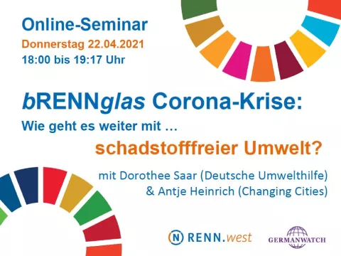 In diesem Online-Seminar möchten wir beleuchten, ob die Corona-Krise uns dem Ziel einer schadstofffreien Umwelt näher gebracht hat oder nicht und was die nächsten wichtigen Schritte auf dem Weg dorthin sind. Fokussiert auf den Bereich der Luftschadstoffe werden uns die Expertinnen Dorothee Saar von der Deutschen Umwelthilfe und Antje Heinrich von Changing Cities theoretische und praktische Einblicke in den Themenkomplex geben.