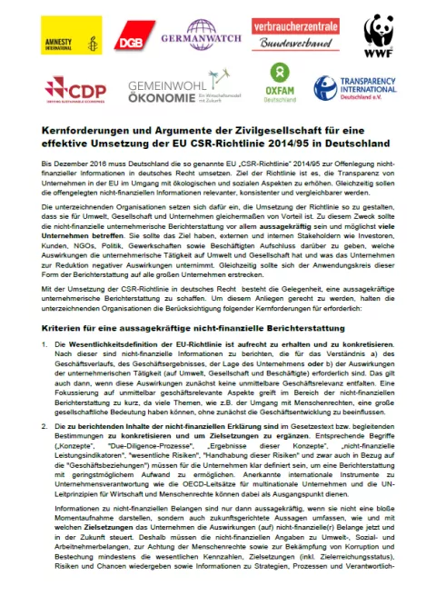 Germanwatch hat gemeinsam mit Amnesty International Deutschland, CDP Europe, dem DGB, der Gemeinwohl-Ökonomie, Oxfam Deutschland, Transparency International Deutschland, dem Verbraucherzentrale Bundesverband und dem WWF Deutschland Kernforderungen für eine effektive Umsetzung der EU-Richtlinie in Deutschland aufgestellt.