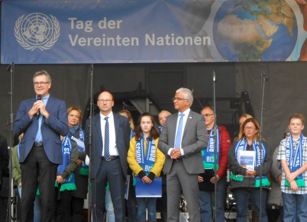 Prof. Dr. Jakob Rhyner, Director UN University Bonn; Franz-Josef Lersch-Mense, Minister für Bundesangelegenheiten, Europa und Medien des Landes Nordrhein-Westfalen und Chef der Staatskanzlei; Ashok Sridharan, Oberbürgermeister der Bundesstadt Bonn und der Chor der Bonn International School (v.l.n.r.).