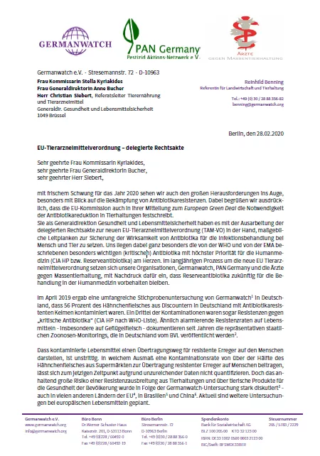 Germanwatch, die Ärzte gegen Massentierhaltung und PAN (Pestizid-Aktions-Netzwerk) fordern mit einem Lobbybrief die EU-Kommission auf, diese Reserveantibiotika für die Humanmedizin vorzubehalten und in Tierfabriken zu verbieten. Für die Überzeugungsarbeit bei Politikerinnen und Politikern benötigen wir Ihre Unterstützung und bitten Sie daher um Spenden!